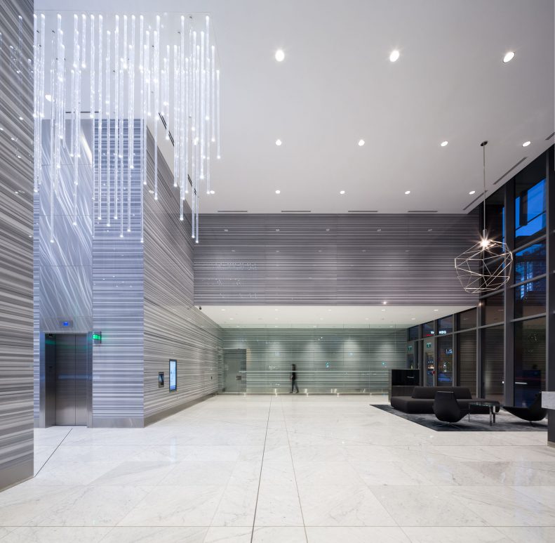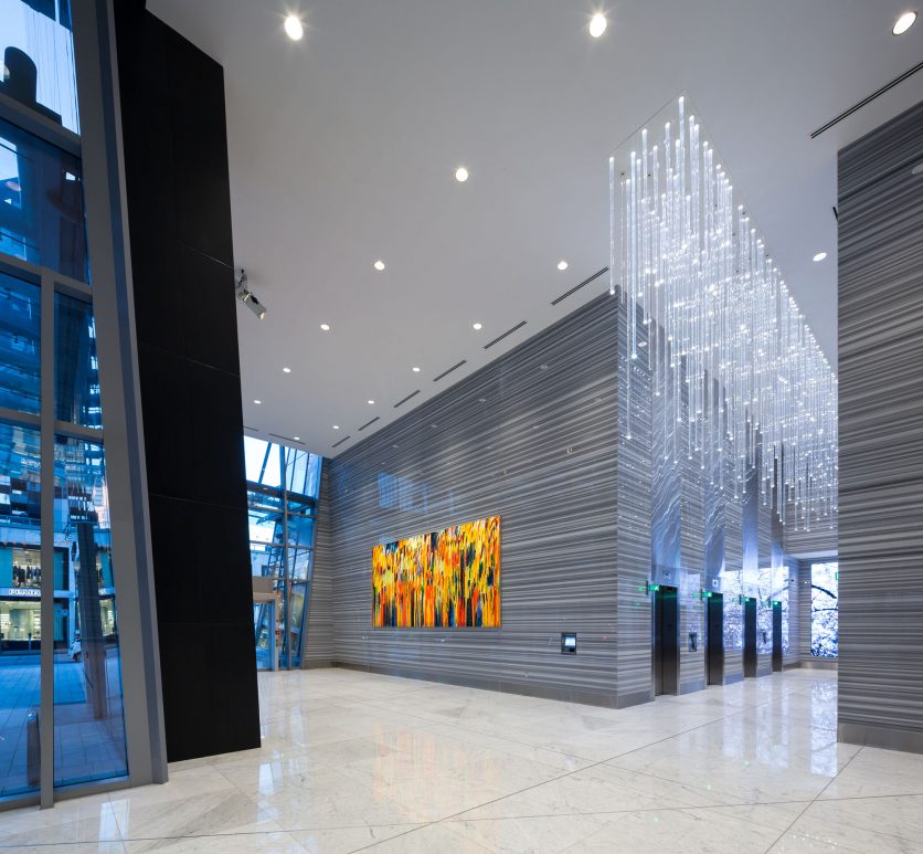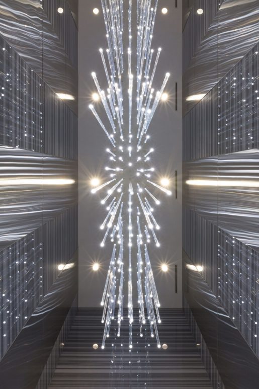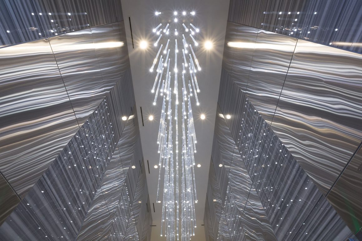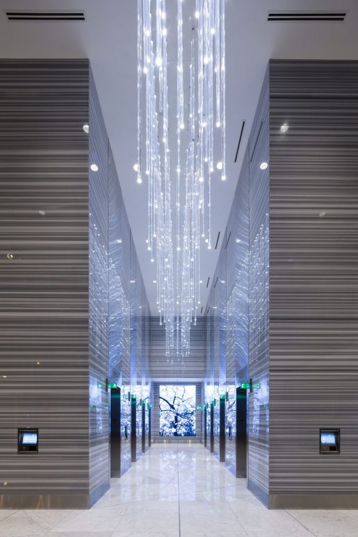 The lobby is a spectacular display of modern architecture and lighting innovation. Hundreds of illuminated rods cascade down to draw people into this signature space.