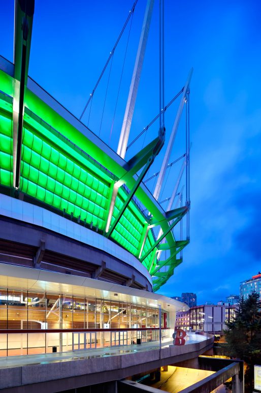 Utilizing a full RGB spectrum, the lighting is focused in three key areas: the façade, the roof, and the support structures of masts and cables, to create light shows for both home sports teams and signature looks for the building itself.