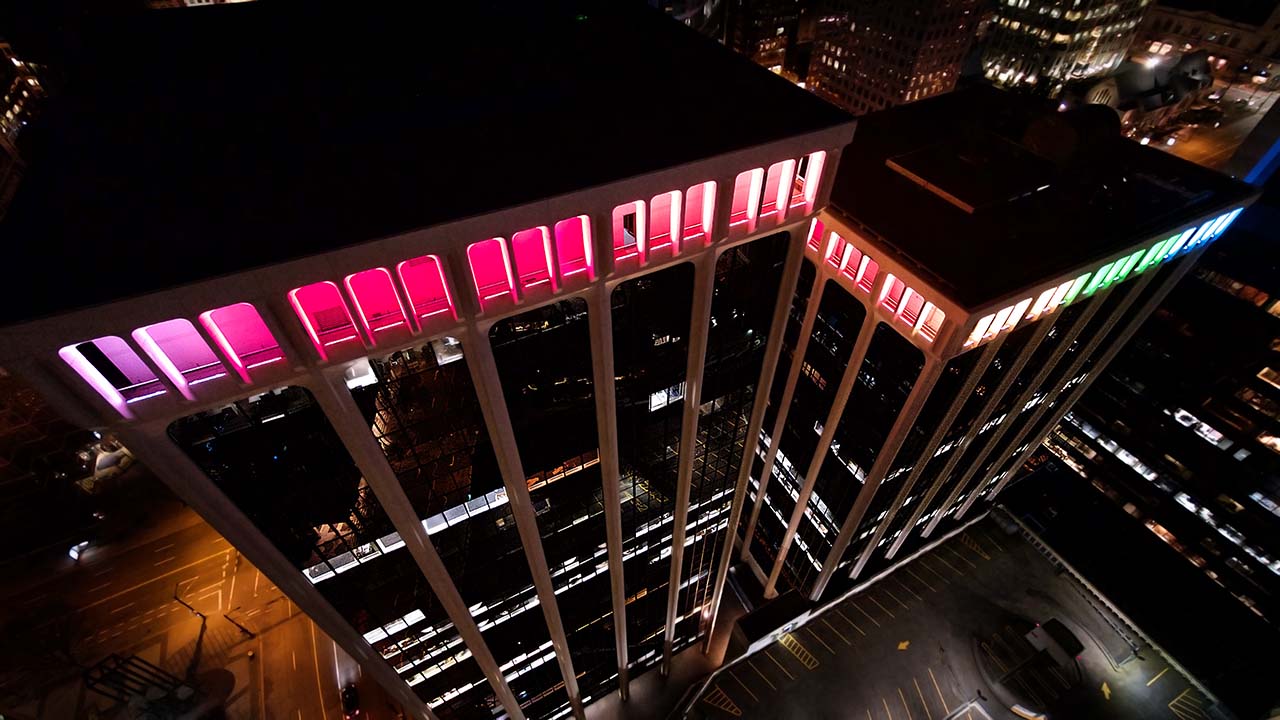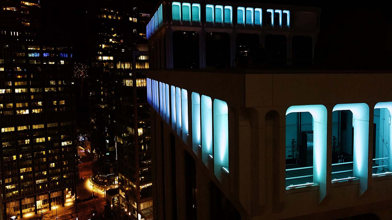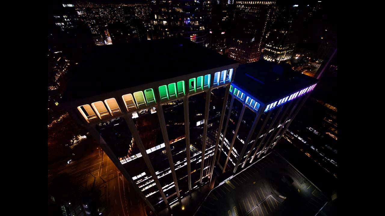 Hudson Pacific Properties embraced this trend and created a new night-time landmark by investing in a dynamic, colour-changing lighting system for the crowns of Vancouver’s most storied groups of buildings, known as the Bentall Centre.