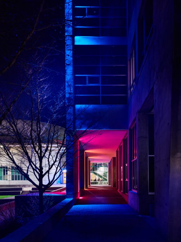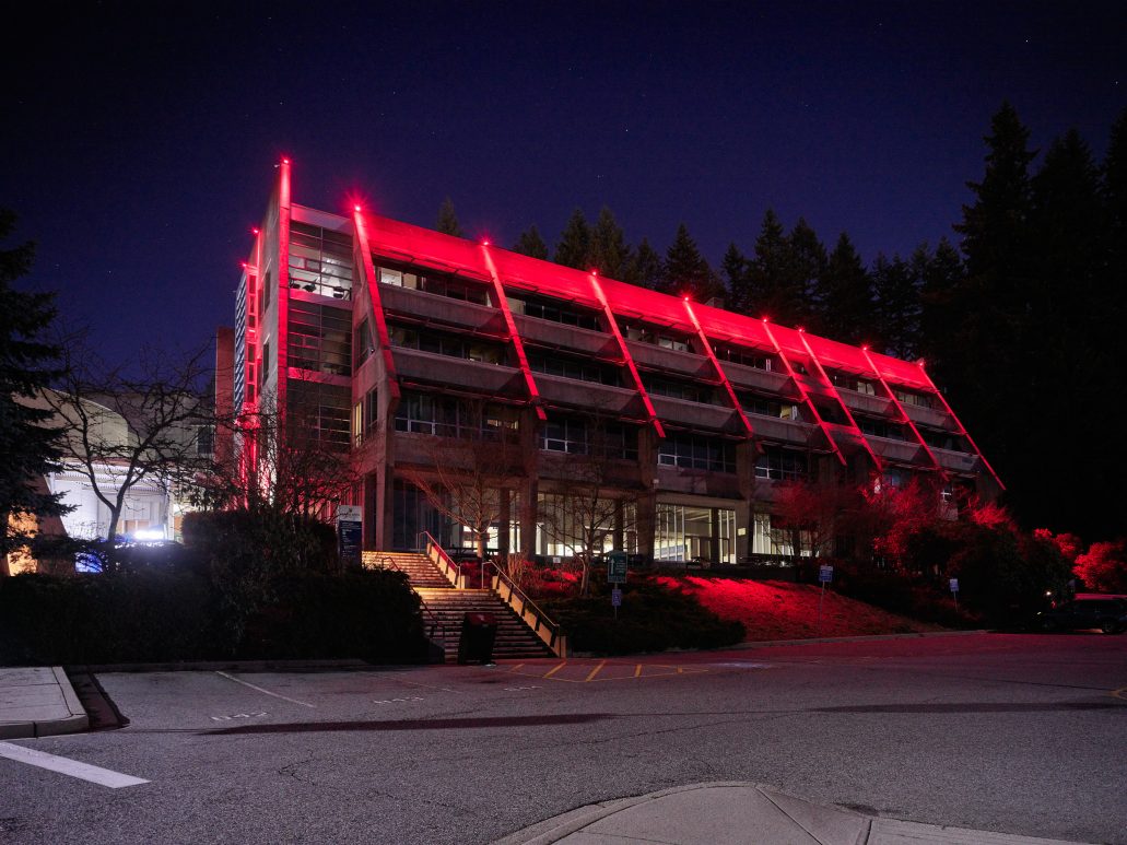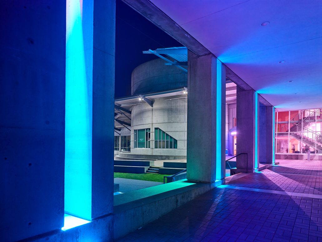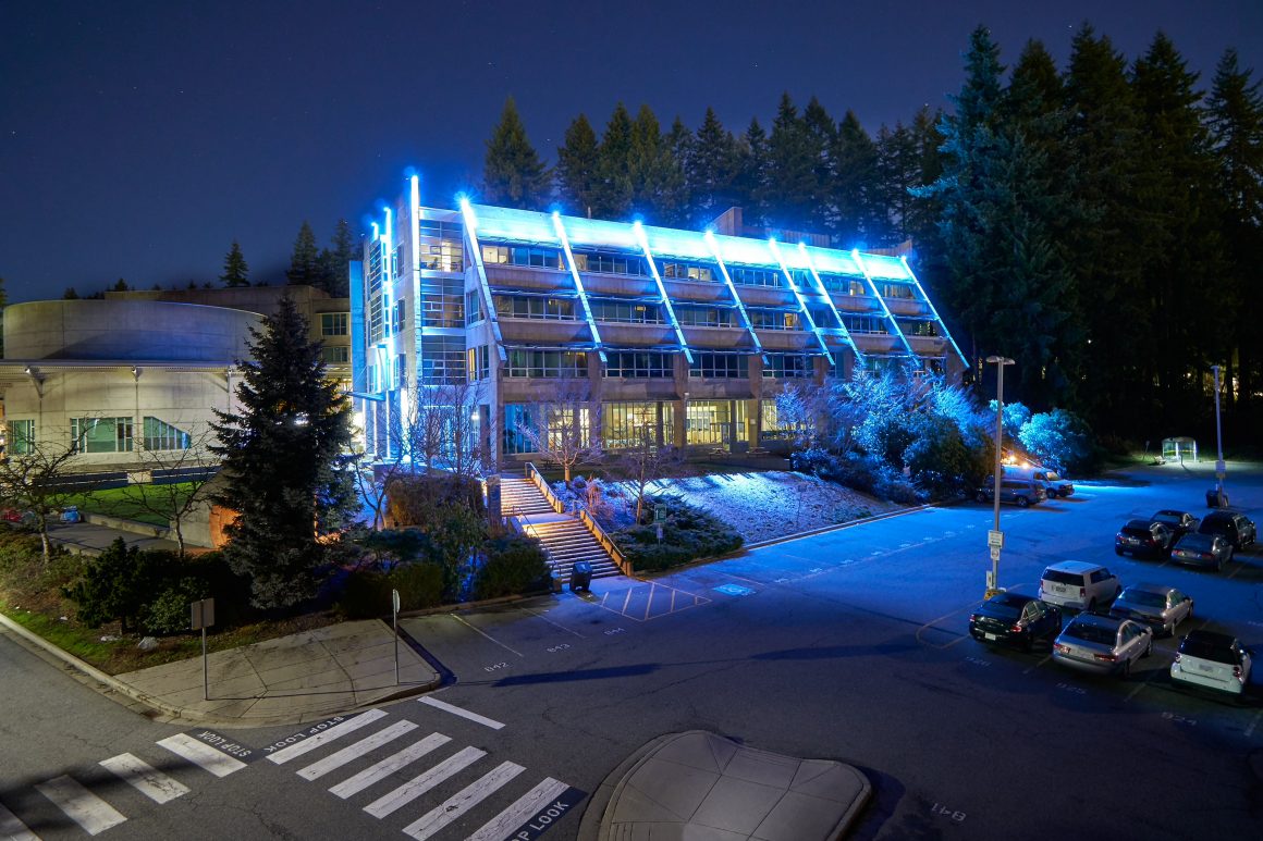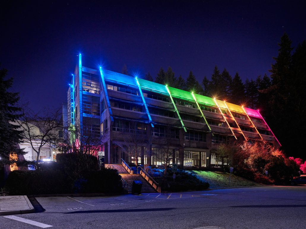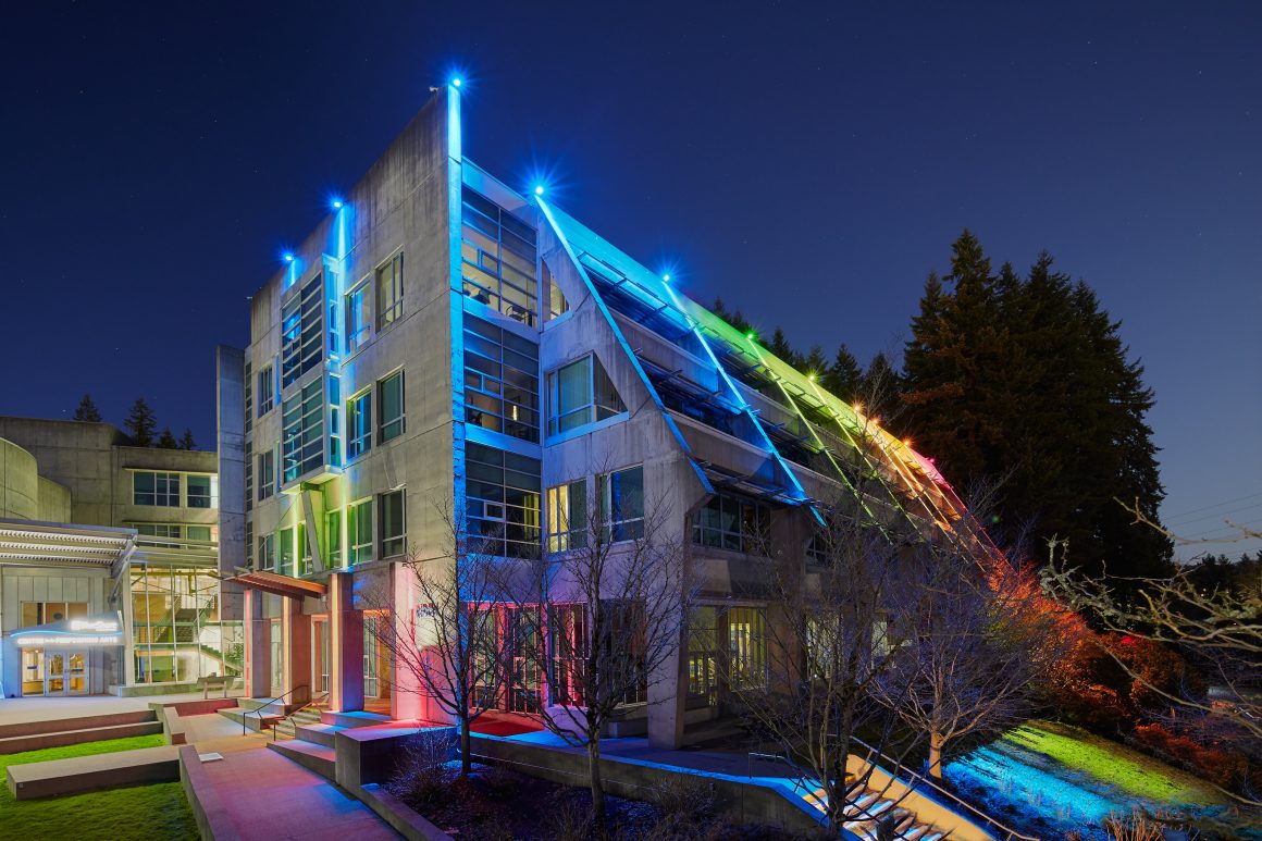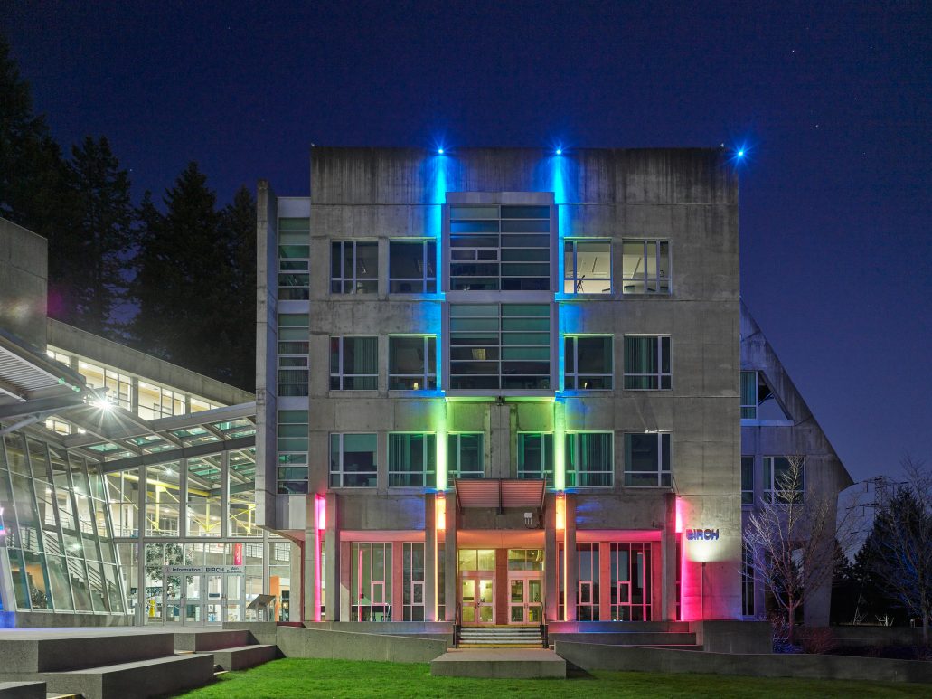 The Capilano University Birch Building is one of the main amenities of the North Shore main campus. A permanent lighting installation was added to the Birch Building and unveiled at CapFest, the University’s 50th anniversary celebration. It is now a mainstay feature for celebrating various seasons, holidays and events on campus including New Student Orientation, Convocation and Blues homes games, as well as community celebrations such as Diwali, Nowruz and Pride Week.