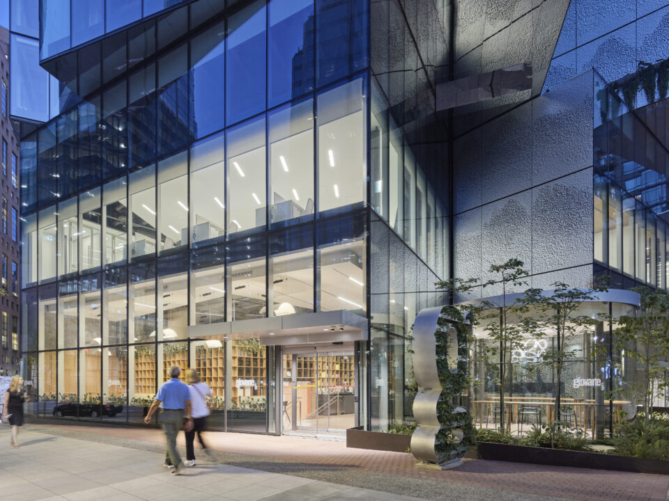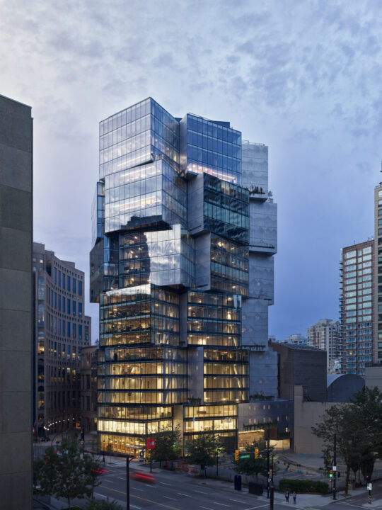 The 24-storey office tower in downtown Vancouver is designed with a distinctive stacked cube configuration inspired by a Japanese Noguchi lamp. Developed by Westbank Projects Corp., this LEED Platinum-certified building prioritizes sustainability, innovation, and occupant well-being. The tower integrates extensive glazing and greenery, creating a visually dynamic and light-filled workspace.