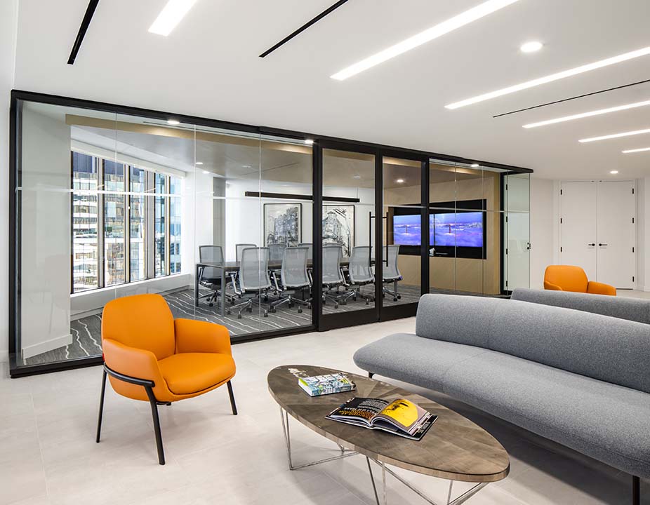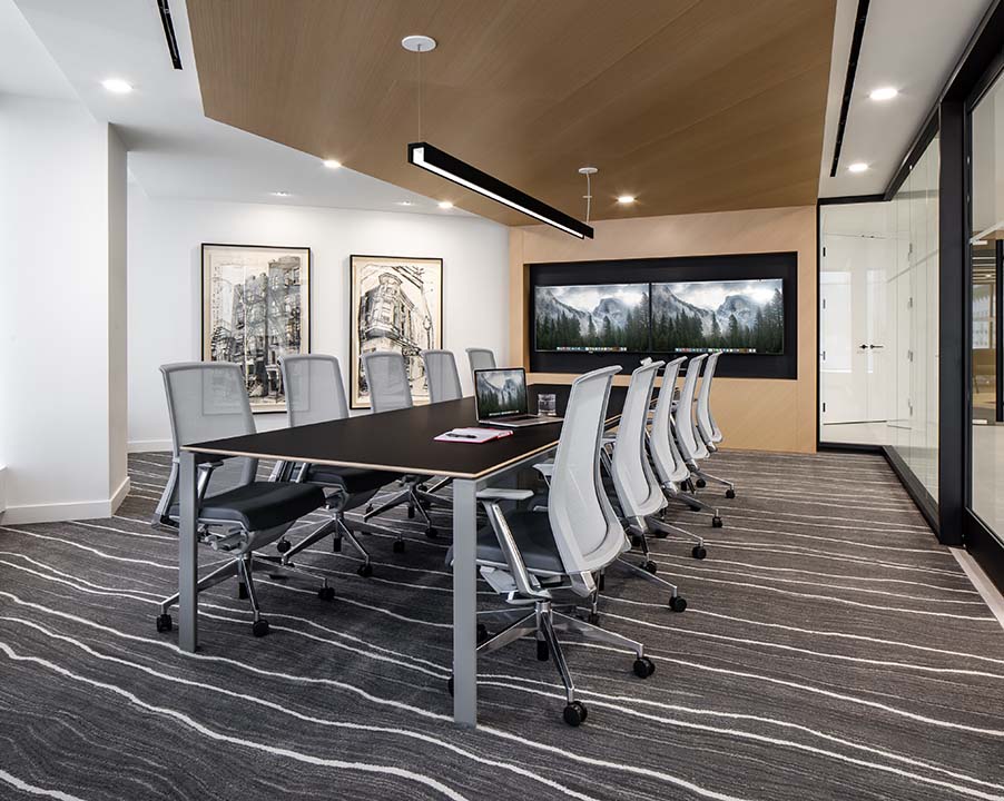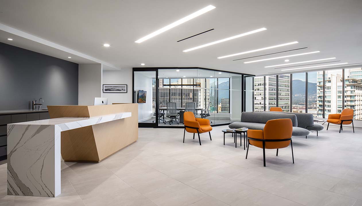This Downtown Vancouver office boasts exceptional design, style and comfort. The lighting design balances and the natural light in the space and compliments the sleek design and office furniture throughout.