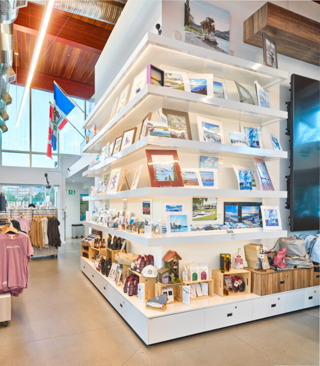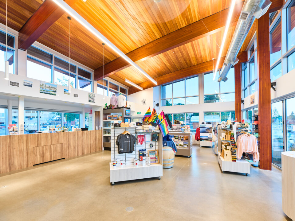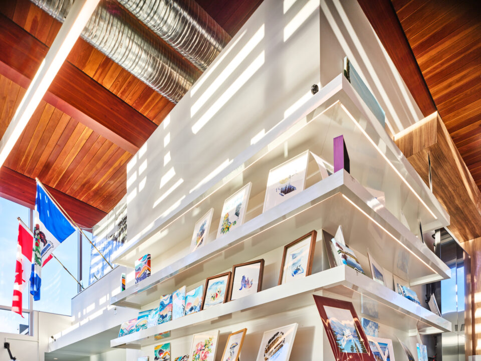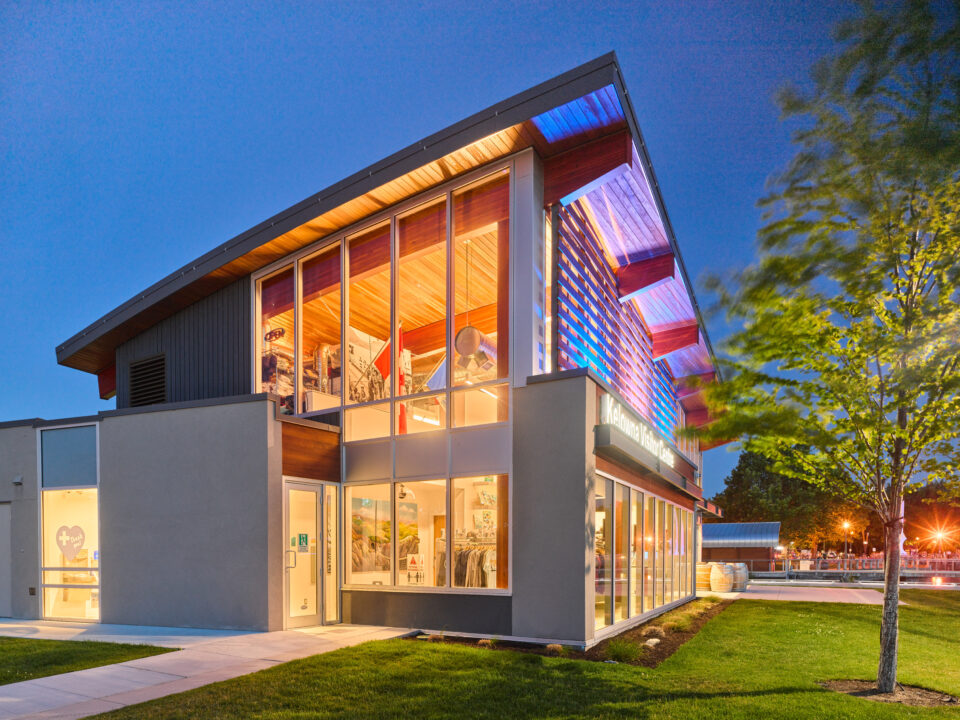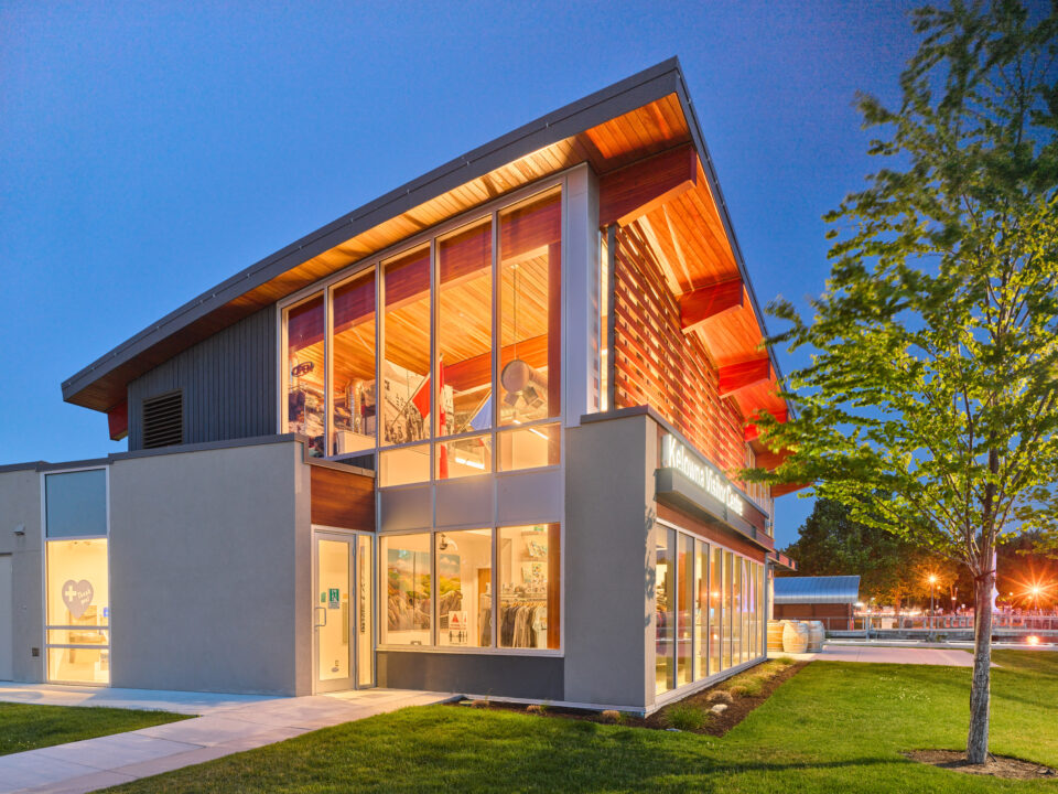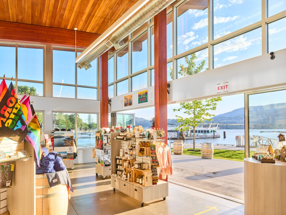 The 3,000-square-foot building reflects the Okanagan’s landscape and tourism culture, maximizing natural light with expansive glazing that offers sweeping lake views.