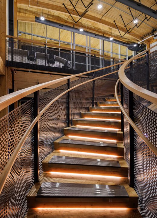 Customized light fixtures complement the local woodwork, enhancing the visual impact of the building’s innovative structural techniques and materials. This thoughtful integration of lighting not only illuminates but also showcases the region’s prowess in design and construction.