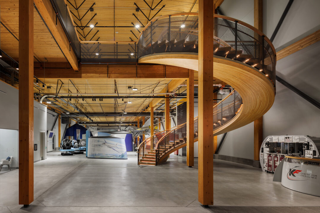 The KF Aerospace Centre for Excellence in Kelowna, BC, stands as a tribute to over 50 years of aerospace achievements. The architectural design, inspired by aircraft, is accentuated by strategically placed lighting that emphasizes key features such as the dramatic spiral staircase, grand entrance, and intricately designed ceilings to showcase interactive exhibits and holographic media effectively. A sophisticated lighting control system allows for scene customization based on user needs.