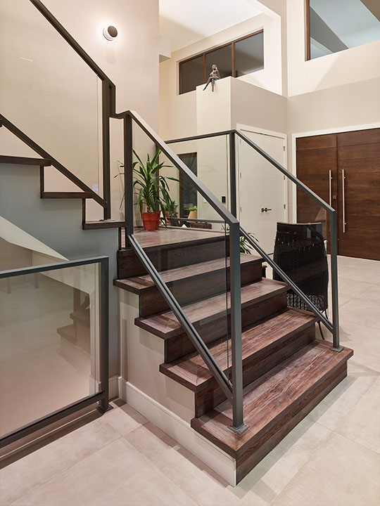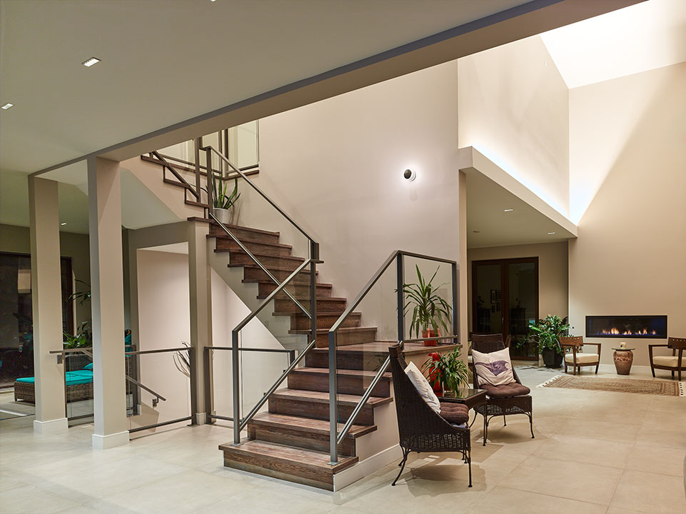 The open and expansive architectural interior complimented with strong geometric forms commands a clear lighting direction that compliments the aesthetic free of suspended decorative lighting or recessed downlights. Within the interior space, the 20’ height foyer and living room is lifted by a broad symmetric linear LED uplight integrated subtly over the entrance partition wall. An accompanying asymmetric LED uplight enhances the open volume delivering general ambient light.