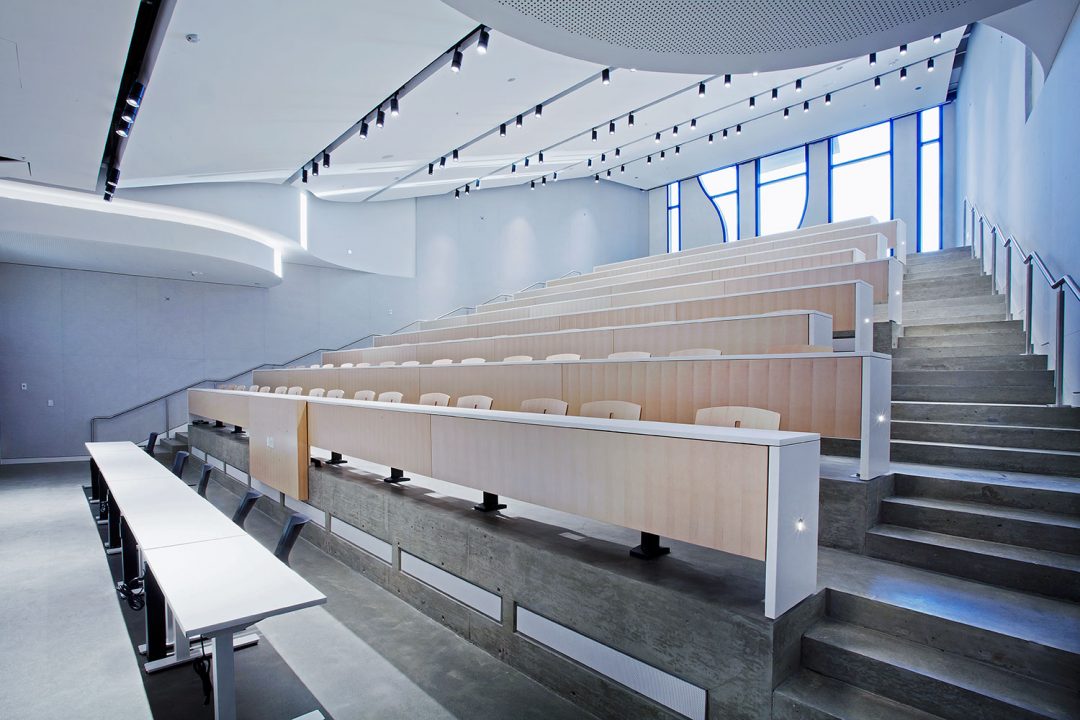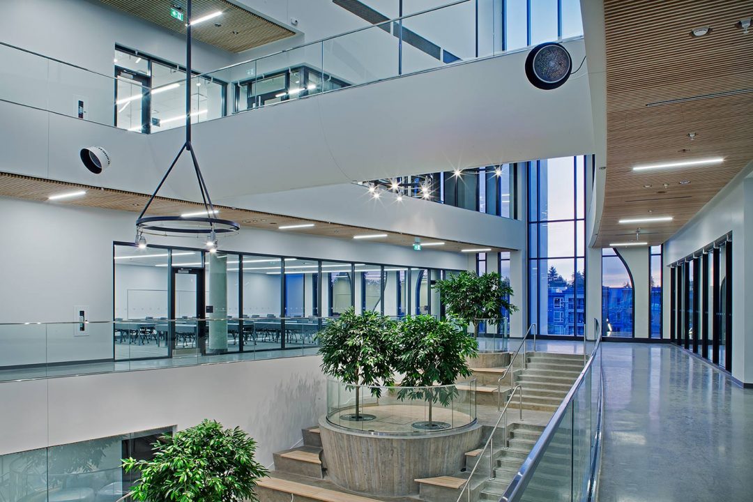 Simon Fraser University’s Surrey campus expansion includes the five-storey, 20,458 square-meter facility, located adjacent to the existing Surrey campus, is home to SFU’s Sustainable Energy Engineering (SEE) program. Designed by the late Bing Thom, and delivered and executed by Revery Architecture (formerly Bing Thom Architects) features teaching labs, an open atrium and a 400-seat theatre that is available for use by both SFU and the community. The building’s façade is designed to represent ‘circuit board’ imagery symbolic of the technological subject matter that will be taught, and has already garnered a national industry award. The project targeted ad has been certified LEED Gold.