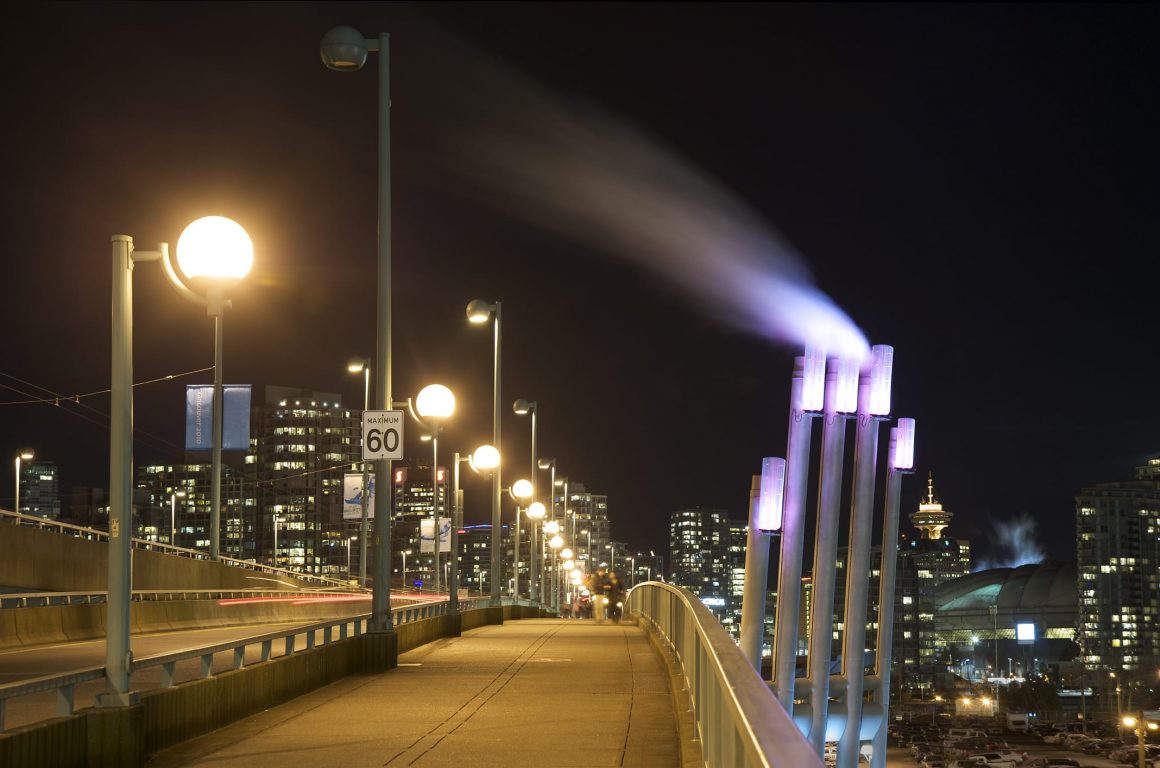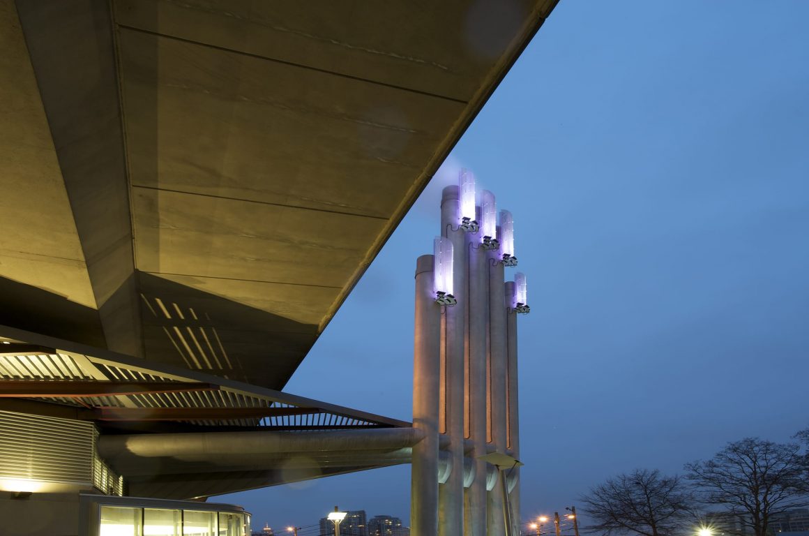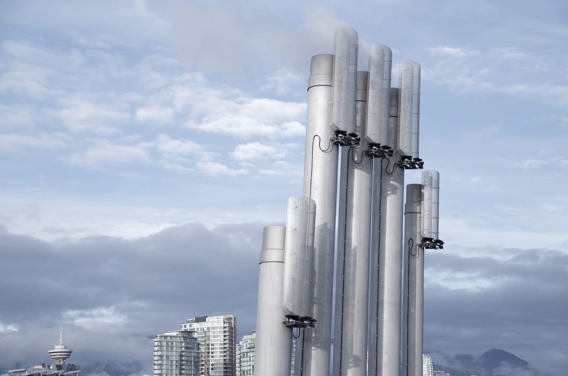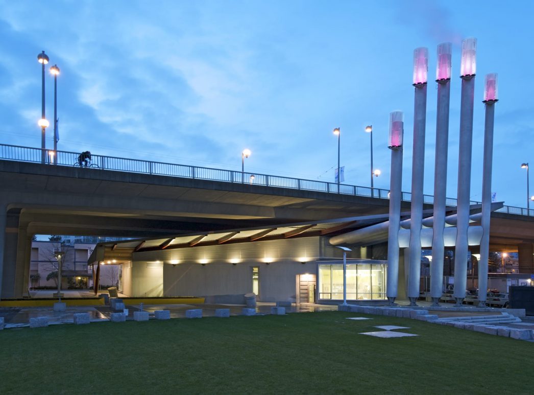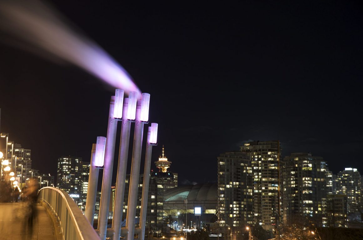 Southeast False Creek Community Energy Centre was developed utilizing sewage heat recovery to provide heating and domestic hot water to the local community. PECHET and ROBB Art and Architecture were retained to design the required five emissions stacks as a public art amenity and mitigate the industrial impact in a modern urban area. To reflect the fact that body heat is transferred from one person to another Pechet and Robb invested the stacks with a human quality. The design concept called for each finger-like stack to be topped with a fingernail-like light fixture. The nail colour was to in response to the amount of energy being generated from the energy centre.