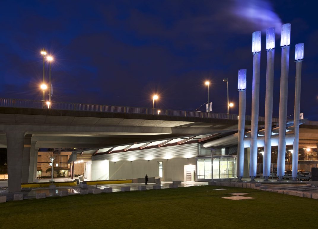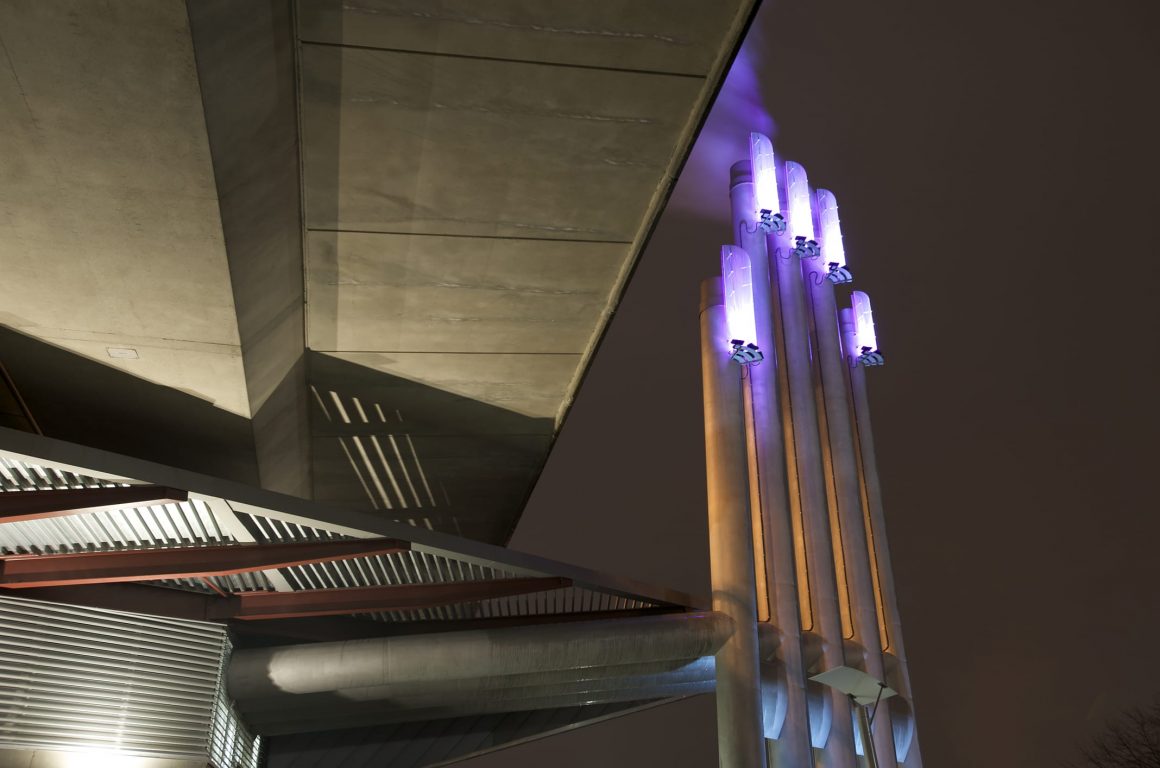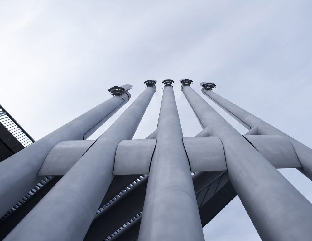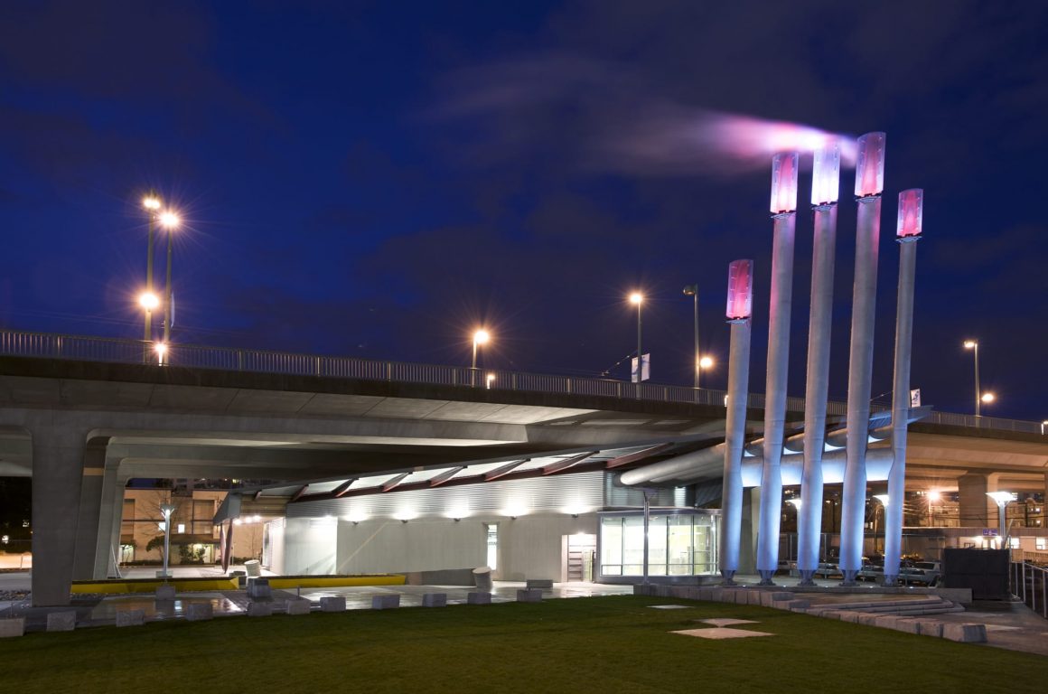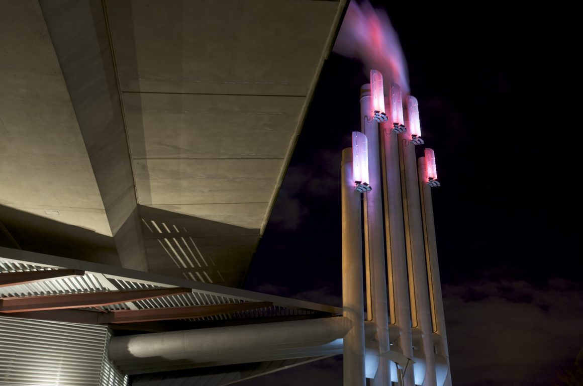 Southeast False Creek Community Energy Centre was developed utilizing sewage heat recovery to provide heating and domestic hot water to the local community. PECHET and ROBB Art and Architecture were retained to design the required five emissions stacks as a public art amenity and mitigate the industrial impact in a modern urban area. To reflect the fact that body heat is transferred from one person to another Pechet and Robb invested the stacks with a human quality. The design concept called for each finger-like stack to be topped with a fingernail-like light fixture. The nail colour was to in response to the amount of energy being generated from the energy centre.