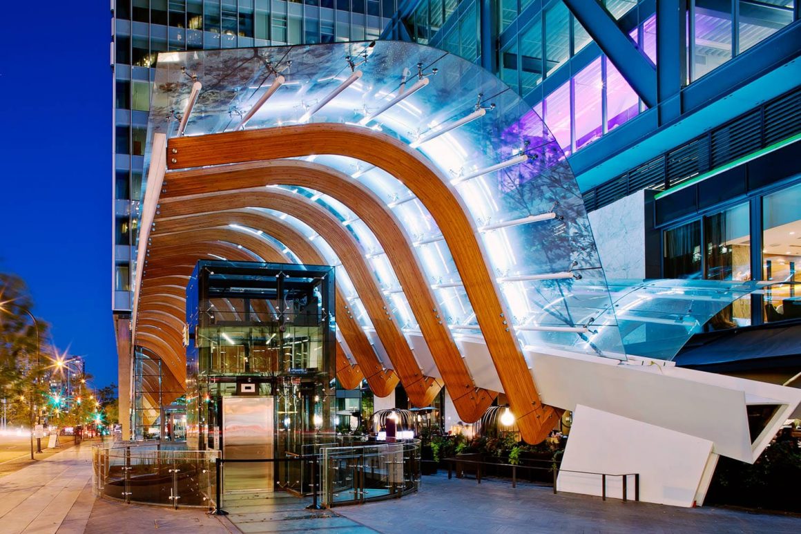 Architectural elements include a spectacular double-height wood-sculpted roof and glass-encased lobby with flourishing gardens, a pristine plaza, cantilevered 4-storey sky gardens, a rooftop forest, expansive green roofs, and LED integrated facade lighting to support graphic animation and videos