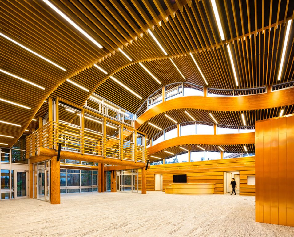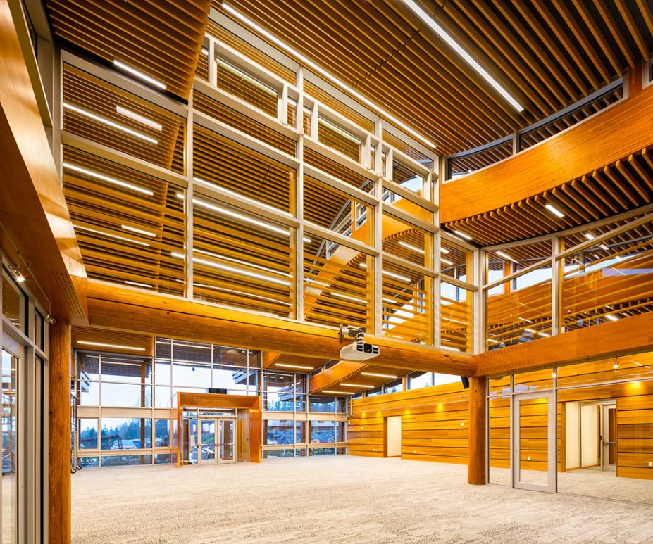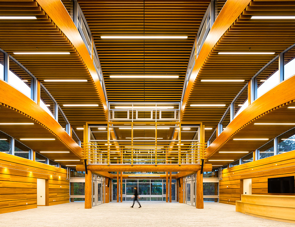 Nestled amidst ocean waters of Burrard Inlet and the North Shore mountains, the Tsleil-Waututh Nation’s new Administration and Health Centre is focal point for community and administrative affairs, meeting the needs of the growing community. Expansive community engagement and consultation contributed to the overall design and function of the facility. Representative of the local culture, the design is closely related to the surrounding cedar forests and the sea. The 31,000 sq. ft. facility boasts 360° views of forest and water, integral to the Tsleil-Waututh people. The central atrium is a Multi-purpose Gathering Space that doubles as a community centre and council chamber for local government.