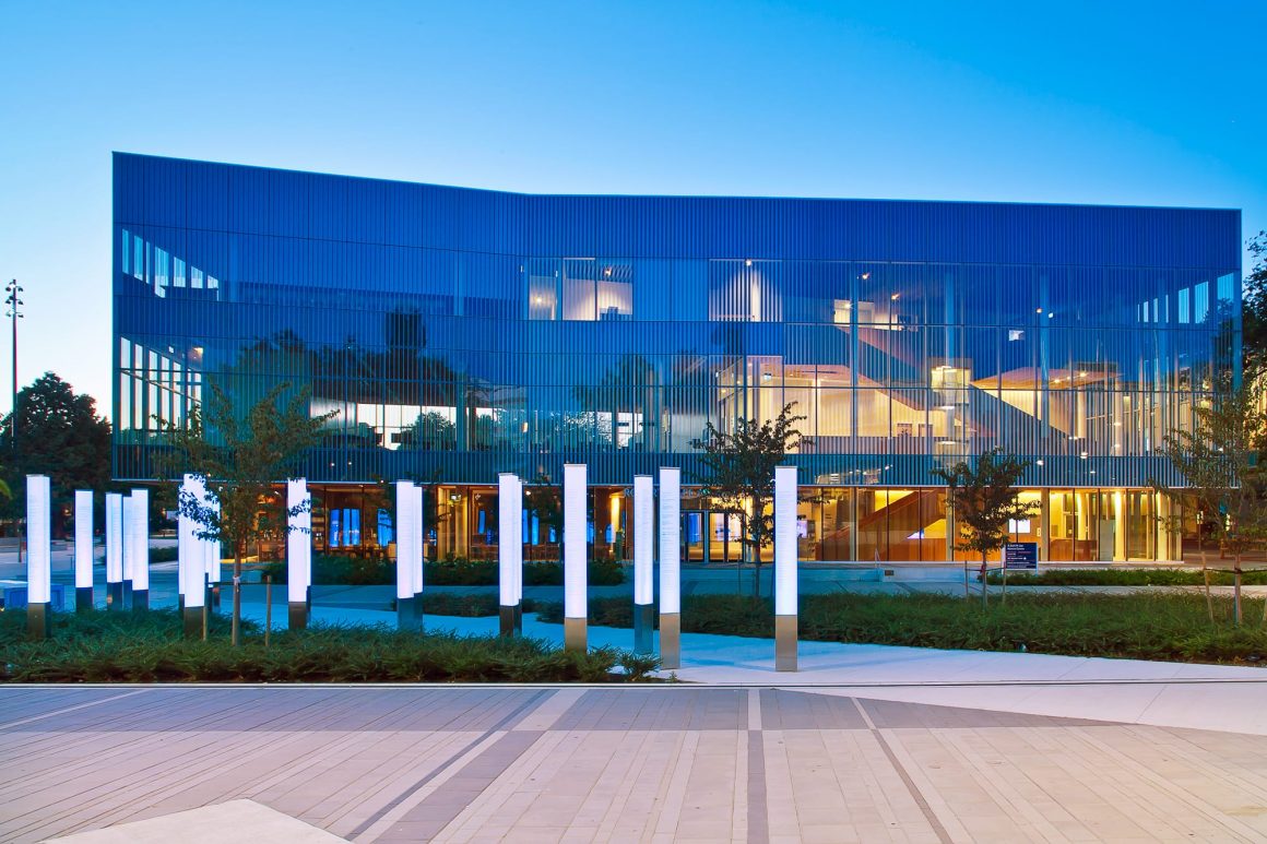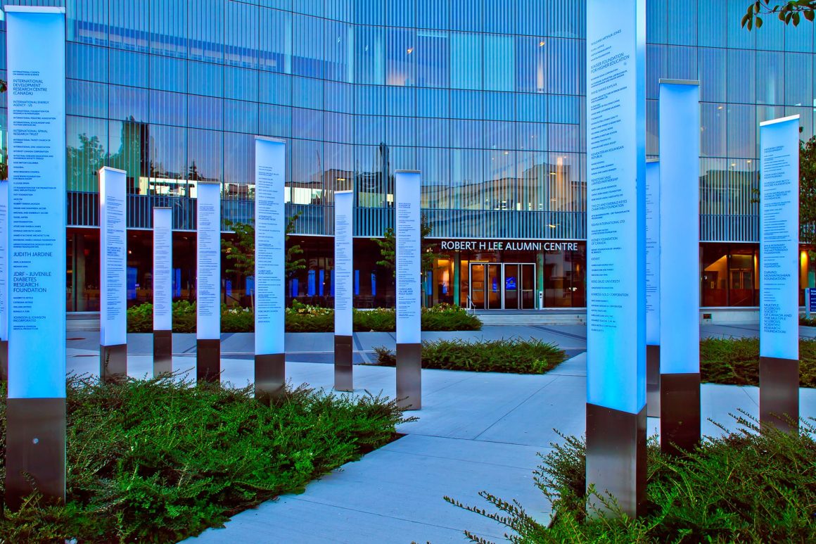 The light colour palette was specifically selected to coordinate with both the UBC brand colour—blue—and the fundraising campaign colour—magenta. As visitors walk through the forest of pillars they find themselves enveloped in the subtle glow of blue-green lights. The visitors’ movement triggers motion detectors to shoot a ripple effect of magenta light through each acrylic lamp. Visitors will notice that as they approach one pillar, their presence changes the light of that pillar, and then another neighbouring pillar, and then its neighbour, and so on enveloping the sidewalk in a ripple of magenta light.